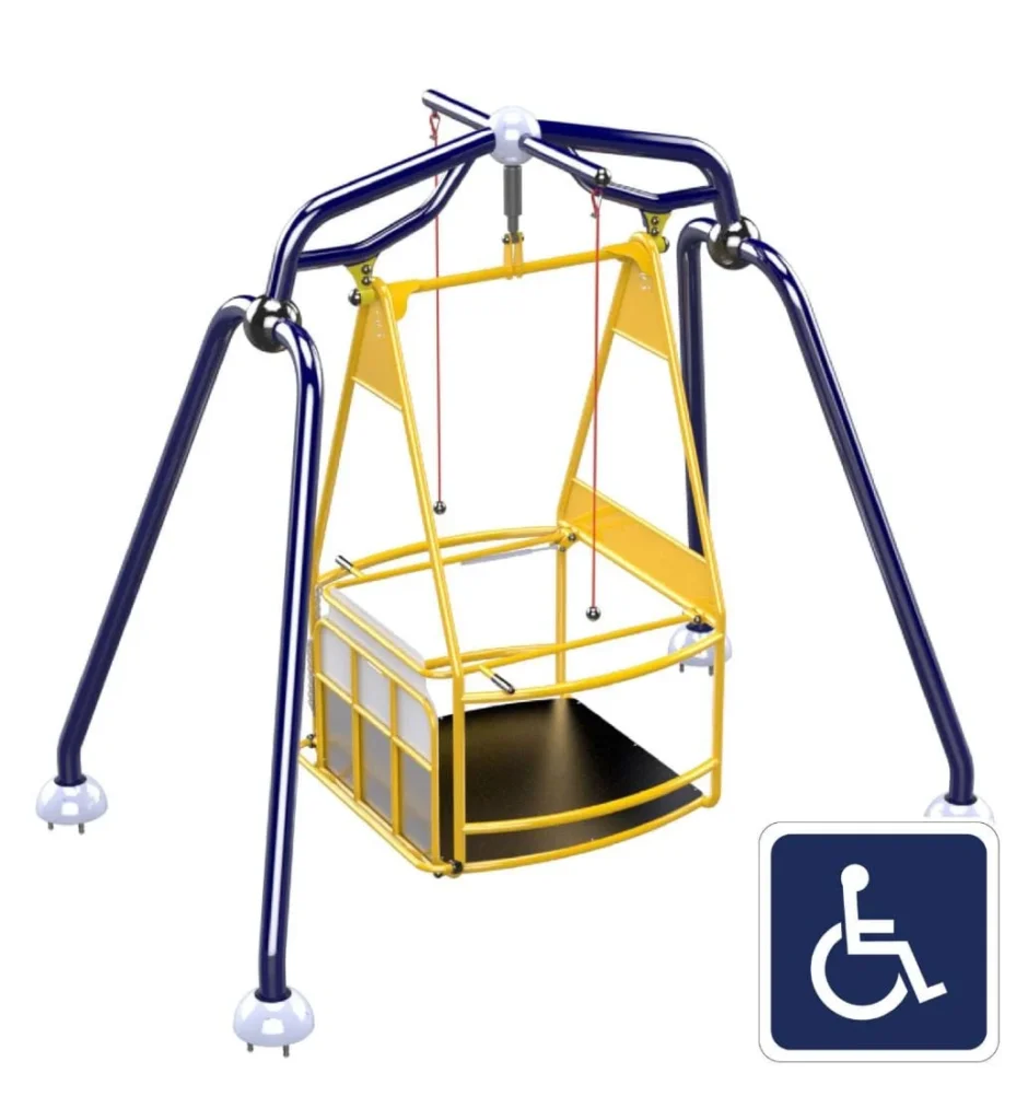 OBJETIVO: Destinado a todos os usuários de cadeira de rodas. Pode ser usado por crianças, jovens e adultos e o cadeirante não precisa de auxílio de outra pessoa para usar o equipamento. É um produto seguro pois possui proteção nas junções da base, sistema de amortecimento que evita movimentos bruscos e trava da plataforma para entrada e saída segura do usuário. Proporciona diversão e inclusão social a todos.