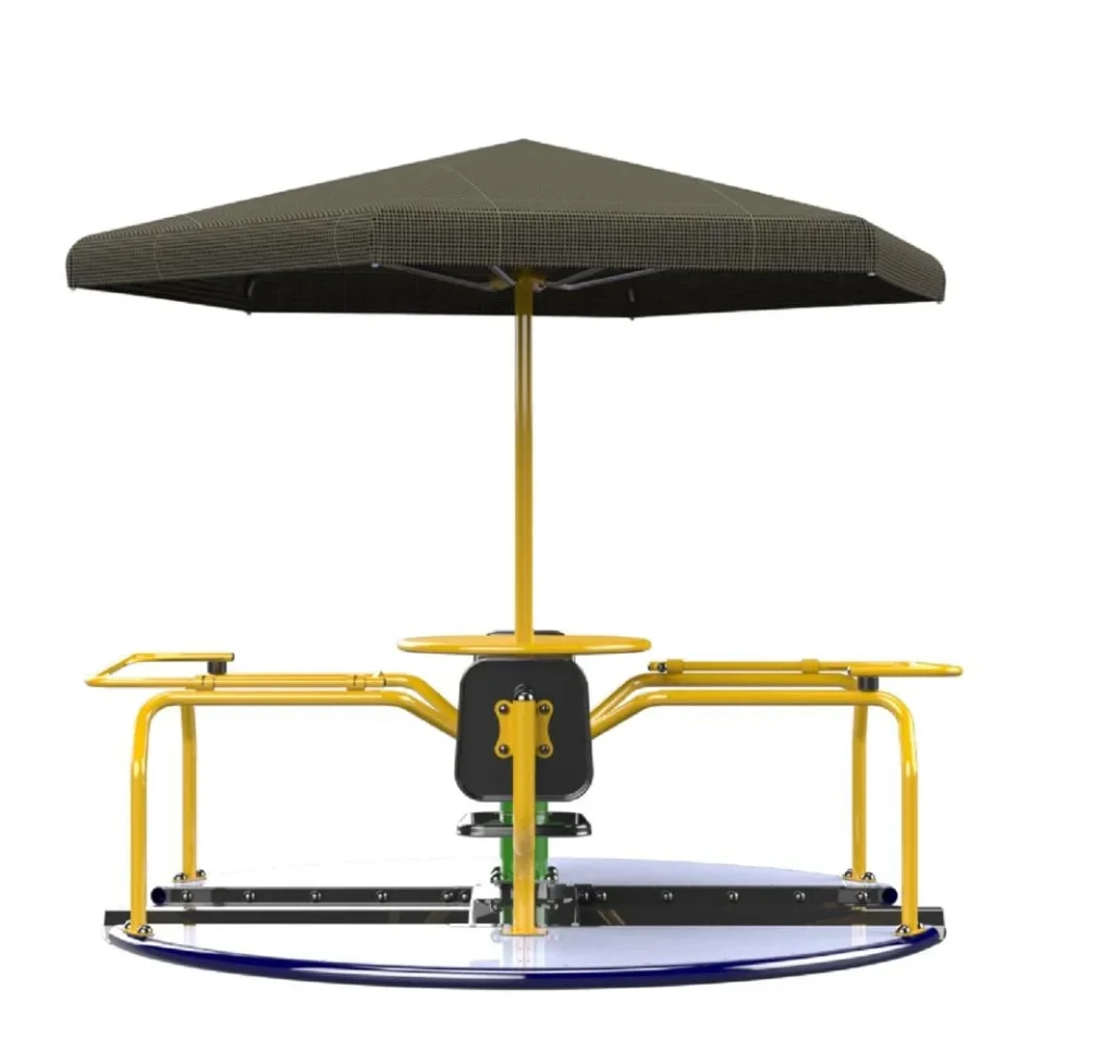 OBJETIVO: Proporciona diversão e exercício. Além da atividade lúdica e física, o brinquedo oferece a oportunidade de inclusão social pois conta com dois espaços para crianças cadeirantes e dois assentos para não cadeirantes onde até quatro crianças podem se acomodar e girar o brinquedo.
