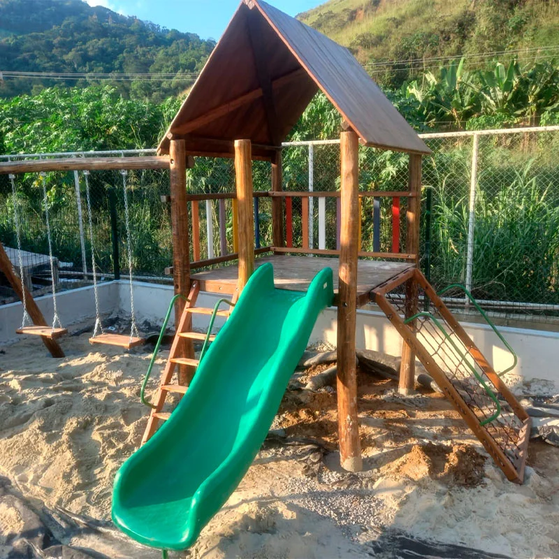 CASA DO TARZAN COM BALANÇO DUPLO, CAMA DE CORSA, ESCADA MARINHO E ESCORREGADOR DE PLÁSTICO
