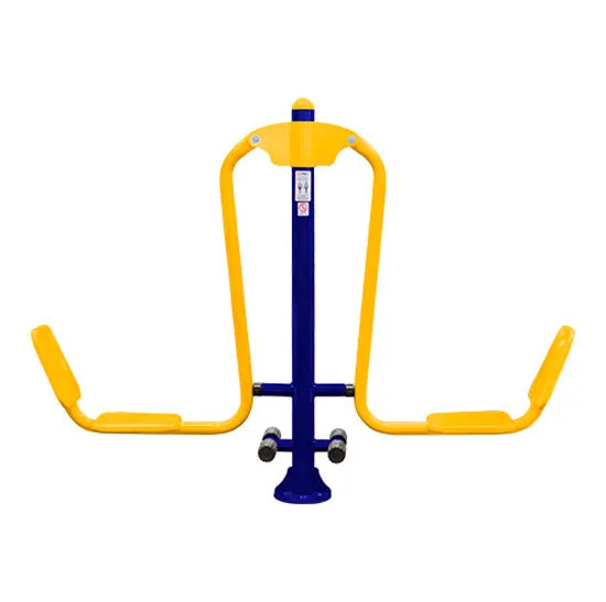 Utiliza-se pinos maciços, todos rolamentados (rolamentos duplos), tratamento de superfície a base de fosfato; película protetiva de resina de poliester termo-endurecível colorido com sistema de deposição de pó eletrostático, batentes redondos de borracha flexível (53mm x 30mm), solda mig, . Chumbador com flange de no mínimo 230 mm x 3/16’, corte a laser com parafusos de fixação zincados de no mínimo 5/8’ x 1 ¼’ e arruela zincada de no mínimo 5/8’, hastes de ferro maciço trefilado de no mínimo 3/8’, parafusos zincados, arruelas e porcas fixadoras; tampão embutido externo em metal de 2’, Tampão embutido interno em plástico injetado de no mínimo 3’ ½’, ambos com acabamento esférico acompanhando a dimensão externa do tubo, acabamentos em plástico injetado e/ou emborrachado. Adesivo refletivo destrutivo 3M de alta fixação com identificação dos grupos musculares, instruções de utilização e dados da fabricante.