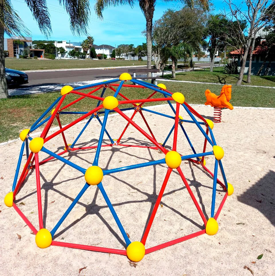 É fabricado com material de ferro tubular galvanizado e pintado com tinta a pó sem materiais pesados medindo 2,70m com altura 1,40m.